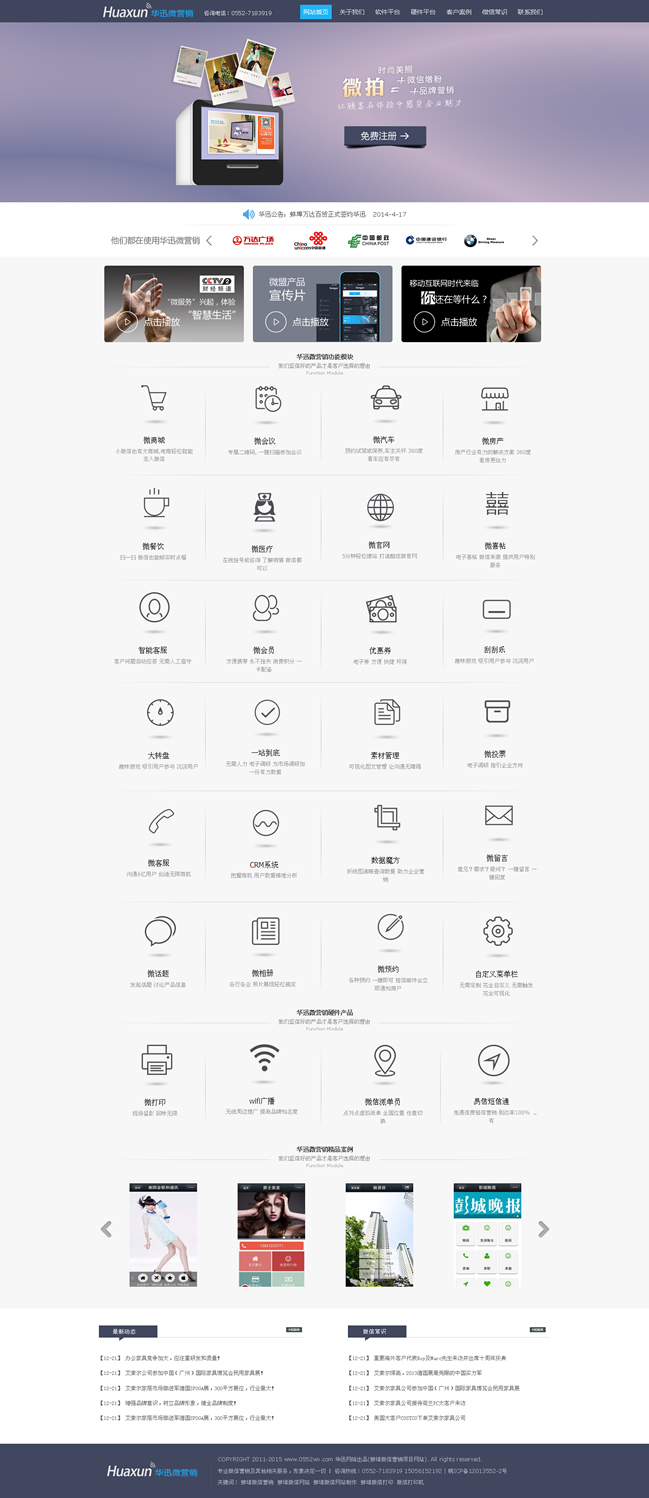 華迅網(wǎng)絡(luò)是打造一個(gè)專門針對(duì)微信公眾賬號(hào)提供營(yíng)銷推廣服務(wù)的第三方平臺(tái)。主要功能是針對(duì)微信商家公眾號(hào)提供與眾不同的、有針對(duì)性的營(yíng)銷推廣服務(wù)。通過華訊微網(wǎng)站平臺(tái),用戶可以輕松管理自己的微信各類信息,對(duì)微信公眾賬號(hào)進(jìn)行維護(hù)、開展智能機(jī)器人、在線發(fā)優(yōu)惠劵、抽獎(jiǎng)、刮獎(jiǎng)、派發(fā)會(huì)員卡、打造微官網(wǎng)、開啟微團(tuán)購(gòu)等多種活動(dòng),對(duì)微信營(yíng)銷實(shí)現(xiàn)有效監(jiān)控,極大擴(kuò)展?jié)撛诳蛻羧汉蛯?shí)現(xiàn)企業(yè)的運(yùn)營(yíng)目標(biāo)。華迅微網(wǎng)站平臺(tái)很好的彌補(bǔ)了微信公眾平臺(tái)本身功能不足、針對(duì)性不強(qiáng)、交互不便利的問題,為商家公眾賬號(hào)提供更為貼心的、且是核心需求的功能和服務(wù)。在線優(yōu)惠劵、轉(zhuǎn)盤抽獎(jiǎng)、微信會(huì)員卡等推廣服務(wù)更是讓微信成為商家推廣的利器。智能客服的可調(diào)教功能讓用戶真正從微信繁瑣的日?头ぷ髦薪饷摮鰜(lái),真正成為商家便利的新營(yíng)銷渠道。
